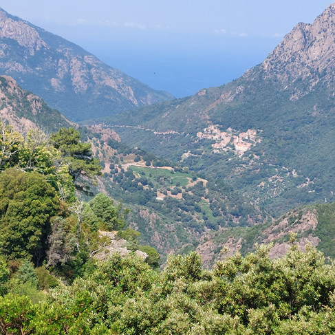 We'd started early and arrived in the lovely hill village of Evisa just around 12 noon. We've passed into "Corse Du Sud" and are well into the heart of the Gorges de Spelunca. Wisely, we decided not to stop for lunch in any of the many extremely tempting places that were setting up to feed and water folk. A lunch break would probably have taken at least an hour and knifing and forking is never going to be conducive to the remainder of the climb!.